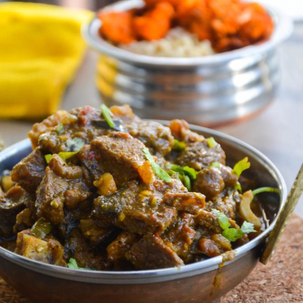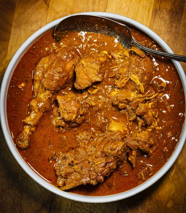 A spicy Goan curry infused with red chili sauce, served with basmati rice.