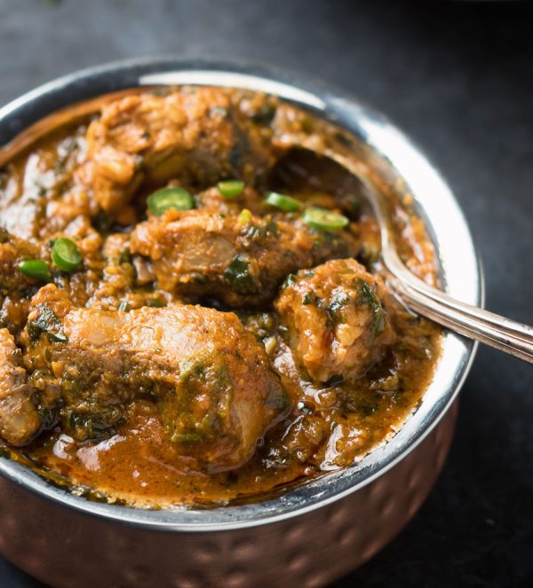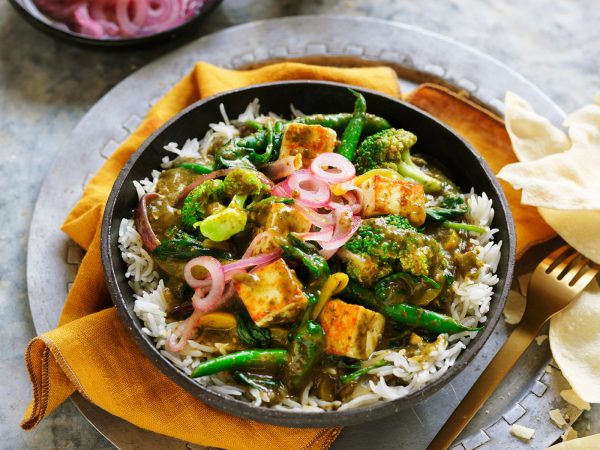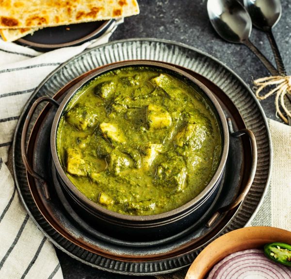 Fresh spinach curry served with basmati rice.